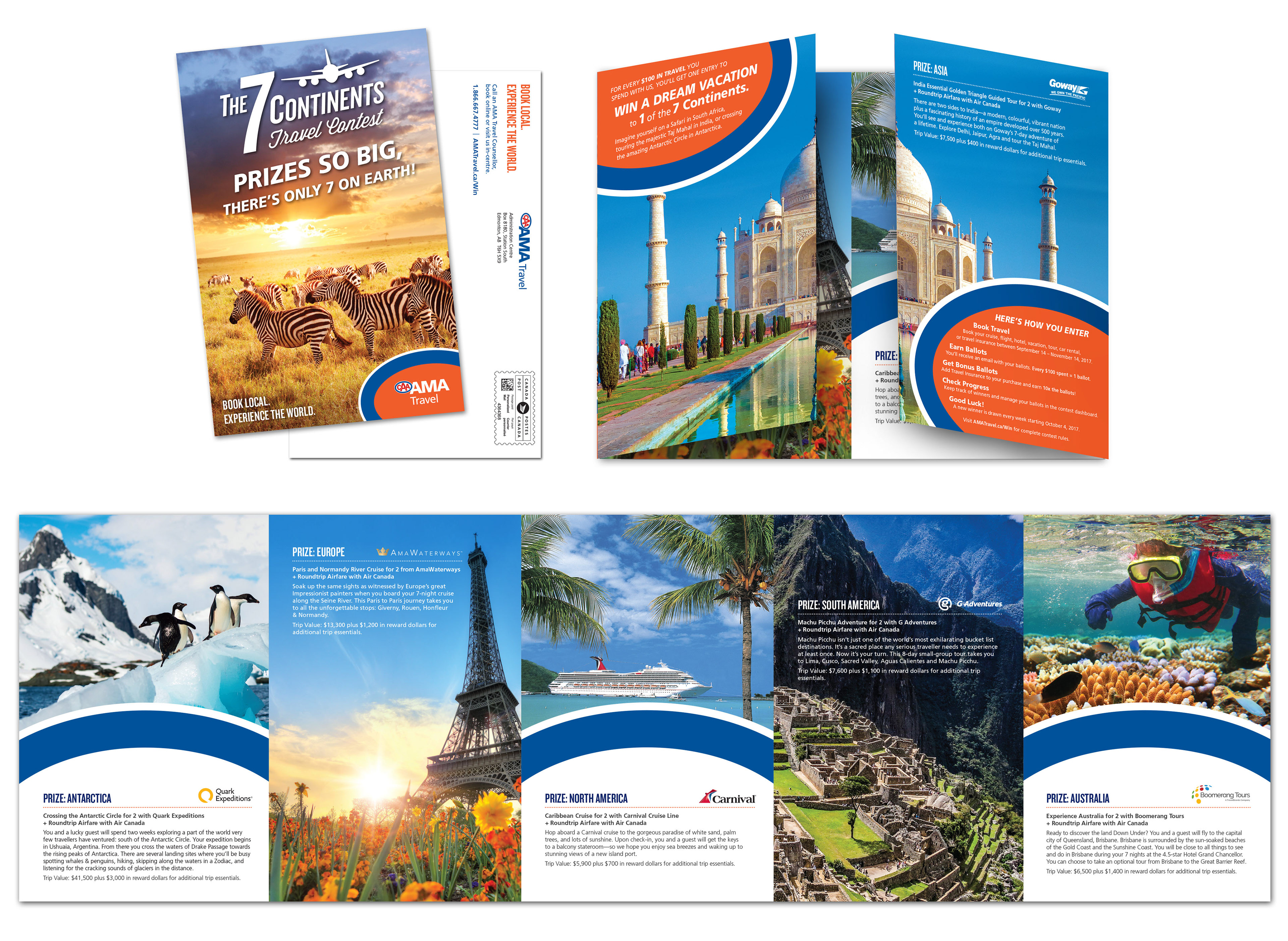 To compete in the competitive business of travel AMA would often have contests. This particular contest relied heavily on a strong visual wordmark and enticing images from around the globe. The prizes were a big draw for people with the chance to win a dream vacation to 1 of the 7 continents!